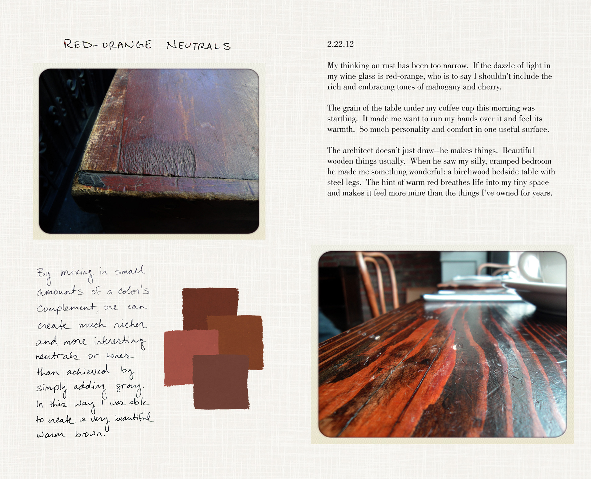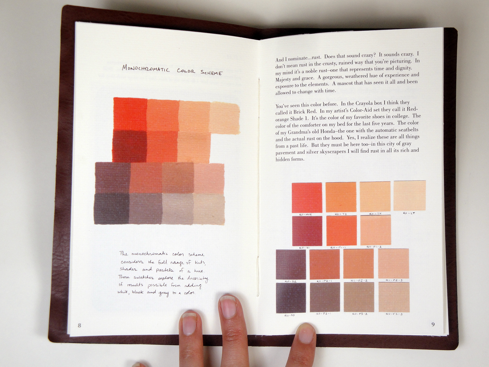 Objective: Design a book that fully explores a personalized experience of the color red-orange. Using narrative, photographs, and a series of painted exercises, various harmonies and studies are presented in a way that enhances the viewers understanding of the hue.