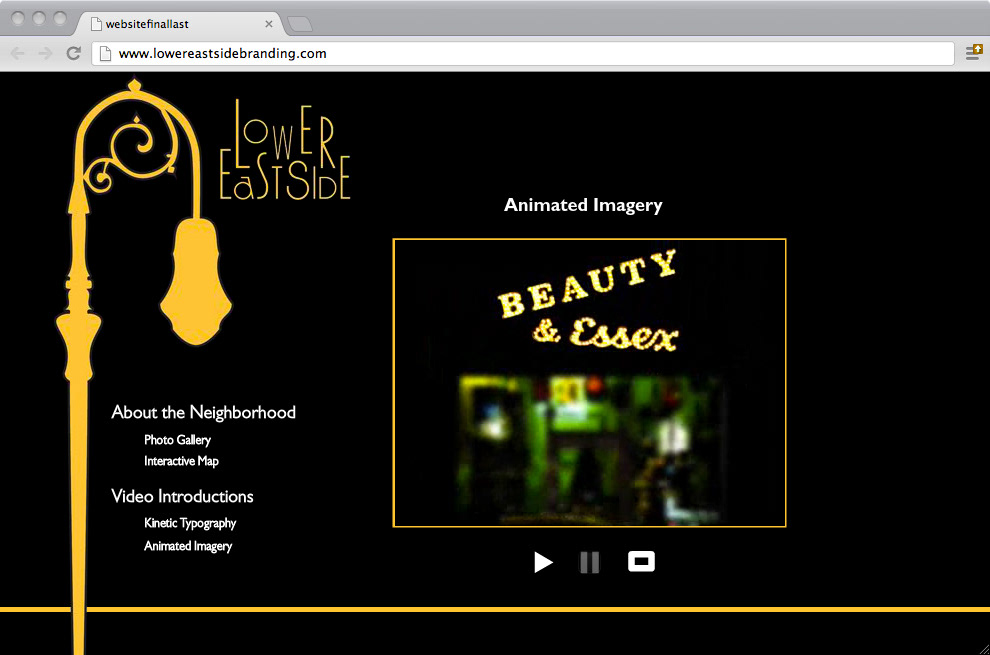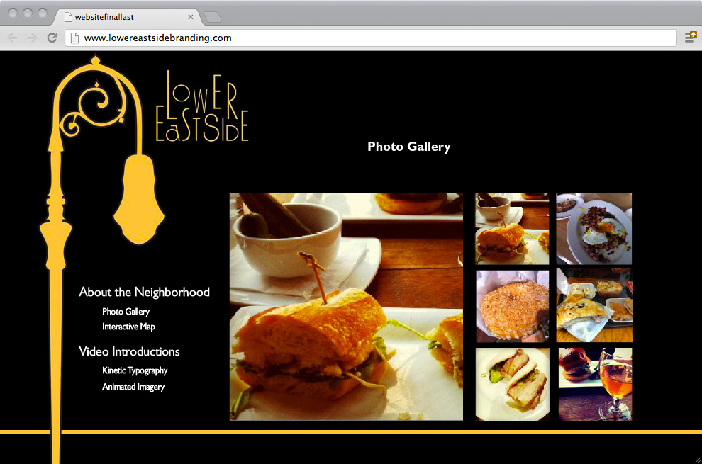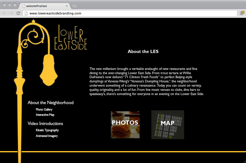 Objective: Create a brand and series of promotional videos for a neighborhood in Manhattan. I chose to redefine the Lower East Side using the diverse dining experiences present throughout, creating both a typographic animation and animating imagery of the establishments themselves.